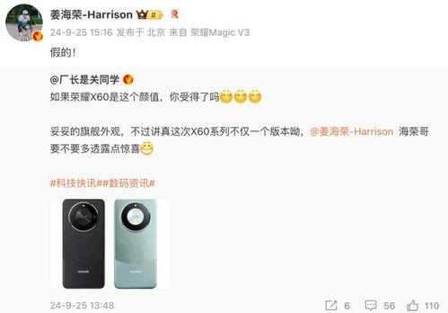 首先,咱们得聊聊荣耀X60的外观设计。从曝光的设计图来看,这款手机采用了全新的设计理念,将时尚与科技完美融合。正面是一块超大屏幕,几乎占据了整个正面,给人一种无边框的视觉体验。而背面则采用了独特的纹理设计,不仅美观大方,还能有效防止手机滑落。